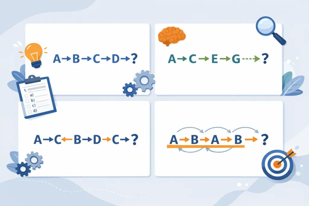 Kunci utama menguasai deret huruf adalah mengenali pola. Ada beberapa pola “klasik” yang sering digunakan pembuat soal, kadang berdiri sendiri, kadang digabung sehingga tampak lebih rumit. Semakin Anda familiar dengan pola ini, semakin cepat Anda bisa “mendekode” soal di ruang ujian.